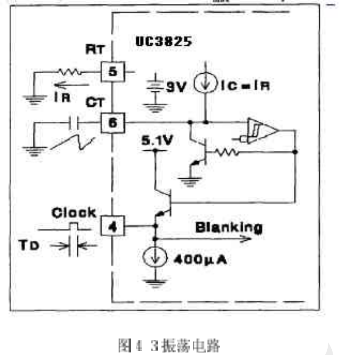 振蕩電路如圖4-3所示。UC3823A、B和UC3825A、B內部都有一個鋸齒波振蕩器。鋸齒波上升沿的斜率由RT、Cr決定,確定RT、CT的方法是:首先根據要求的最大占空比Dmax、選擇RT,再根據要求的頻率以及RT和Dmax選擇CT計算公式為: