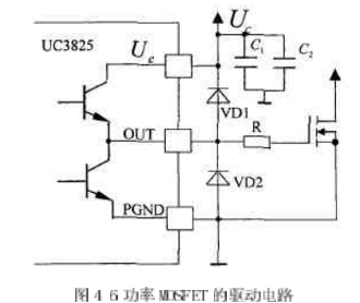 功率MOSFET驅動電路如圖4-6所示。UC3825推拉式輸出電路的每個輸出端都可輸出峰值為2A的電流。該輸出電流在20ns內可使1000pF電容兩端的電壓上升15V。采用獨立的集電極電源Uc和功率地線PGND腳,能夠減小大功率門極驅動噪聲對集成電路內模擬電路的干擾。每個輸出端(OUT)到Uc和PGND之間,都應加入一只3A的肖特基二極管(IN5120,USID245或相同性能的器件),如圖4-6所示。該二極管可將輸出電壓的幅值鉗位在電源電壓,這對任何電感性和電容性負載都是必要的。