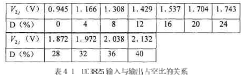 通過實驗可知,UC3825的2腳輸入和outA.、outB輸出的PWM脈沖信號的占空比是滿足線性關系的。具休實驗數據如表4-1所示。我們定義UC3825的2腳輸入為v2,輸出的PM信號占空比為D。從表41中的數據可以看出,端口2的數值范鬧為:0.945V~-2.132v,而PWM脈沖信號的占空比在0%~-40%之間變化,與上述的結論是吻合的。