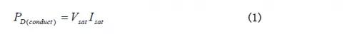 導(dǎo)通損耗可由開關(guān)兩頭電壓和電流波形乘積測(cè)得。這些波形都近似線性,導(dǎo)通期間的功率損耗由式(1)給出。