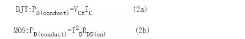 控制這個(gè)損耗的典型方法是使功率開關(guān)導(dǎo)通期間的電壓降最小。要達(dá)到這個(gè)目的,設(shè)計(jì)者必須使開關(guān)工作在飽和狀態(tài)。這些條件由式(2a)和式(2b)給出,通過基極或柵極過電流驅(qū)動(dòng),確保由外部元器件而不是功率開關(guān)本身對(duì)集電極或漏極電流進(jìn)行控制。
