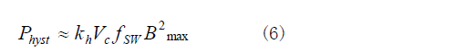 磁滯損耗與繞組的匝數(shù)和驅(qū)動(dòng)方式有關(guān)。它決定了每個(gè)工作周期在B-H曲線內(nèi)掃過的面積。掃過的面積就是磁場(chǎng)力所作的功,磁場(chǎng)力使磁心內(nèi)的磁疇重新排列,掃過的面積越大,磁滯損耗就越大。該損耗由式(6)給出。