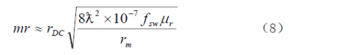 電阻損耗是變壓器或電感內(nèi)部繞組的電阻產(chǎn)生的損耗。有兩種形式的電阻損耗:直流電阻損耗和集膚效應(yīng)電阻損耗。直流電阻損耗由繞組導(dǎo)線的電阻與流過的電流有效值二次方的乘積所決定。集膚效應(yīng)是由于在導(dǎo)線內(nèi)強(qiáng)交流電磁場(chǎng)作用下,導(dǎo)線中心的電流被“推向”導(dǎo)線表面而使導(dǎo)線的電阻實(shí)際增加所致,電流在更小的截面中流動(dòng)使導(dǎo)線的有效直徑顯得小了。式(8)給出了這兩個(gè)損耗在一個(gè)表達(dá)式中的計(jì)算式。