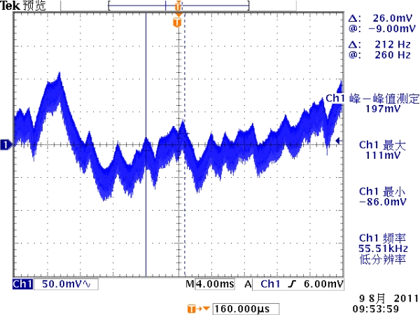 低頻紋波是與輸出電路的濾波電容容量相關。因為開關電源體積的約束,電解電容的容量不可能無約束地添加,導致輸出低頻紋波的殘留,該輸出紋波頻率隨整流電路方式的不同而不同。