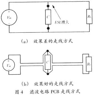 圖4閃現了在一個PCB上輸入電源(Vin)至負載(RL)的不同走線辦法。為了下降濾波電容器(C)的ESL,其引線長度應盡量減短;而Vin。正極至RL和Vin負極至R1的走線應盡量靠近。