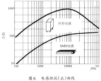 電感一般存在等效并聯電阻(EPR)和等效并聯電容(Cp)二個寄生參數。圖6是電感在不同作業頻率下的阻抗(ZL)。