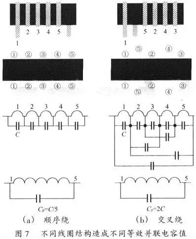 在開關電源中電感的Cp應該控制得越小越好。一起有必要留心到,同一電感量的電感會由于線圈結構不同而產生不同的Cp值。圖7就閃現了同一電感量的電感在二種不同的線圈結構下不同的Cp值。圖7(a)電感的5匝繞組是按次第繞制。這種線圈結構的Cp值是l匝線圈等效并聯電容值(C)的1/5。圖7(b)電感的5匝繞組是按穿插次第繞制。其間繞組4和5放置在繞組1、2、3之間,而繞組l和5非常靠近。這種線圈結構所產牛的Cp是1匝線圈C值的兩倍。