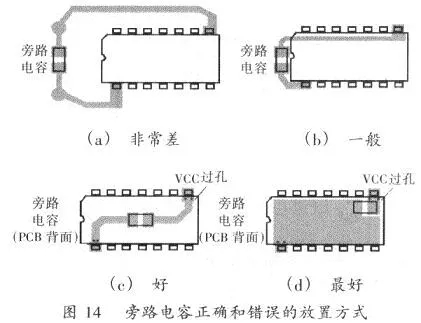 旁路電容(Decouple)的放置也要考慮到它的串聯電感值。旁路電容有必要是低阻抗和低ESL乩的瓷片電容。但假設一個高品質瓷片電容在PCB上放置的辦法不對,它的高頻濾波功用也就消失了。圖14閃現了旁路電容正確和差錯的放置辦法。