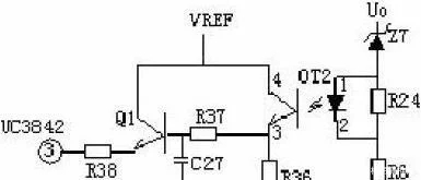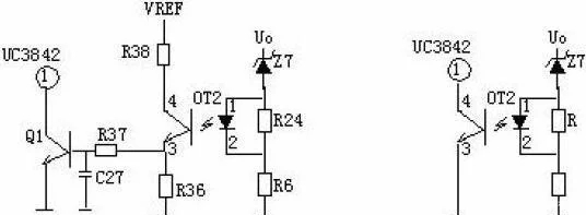 輸出限壓保護電路:輸出限壓保護電路如下圖,當輸出電壓升高,穩壓管導通光耦導通,Q1基極有驅動電壓而道通,UC3842③電壓升高,輸出下降,穩壓管不導通,UC3842③電壓下降,輸出電壓升高。循環往復,輸出電壓將安穩在一范圍內(取決于穩壓管的穩壓值)。