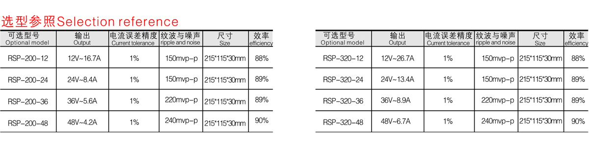 內建主動式功率因子矯正功能(active PFC) 1U 低高度設計—75W~320W: 30 mm, 500W: 40.5 mm 內建恒流限制線路 (RSP-75/100/150) 內建遙感功能(remote sense) (僅RSP-500)